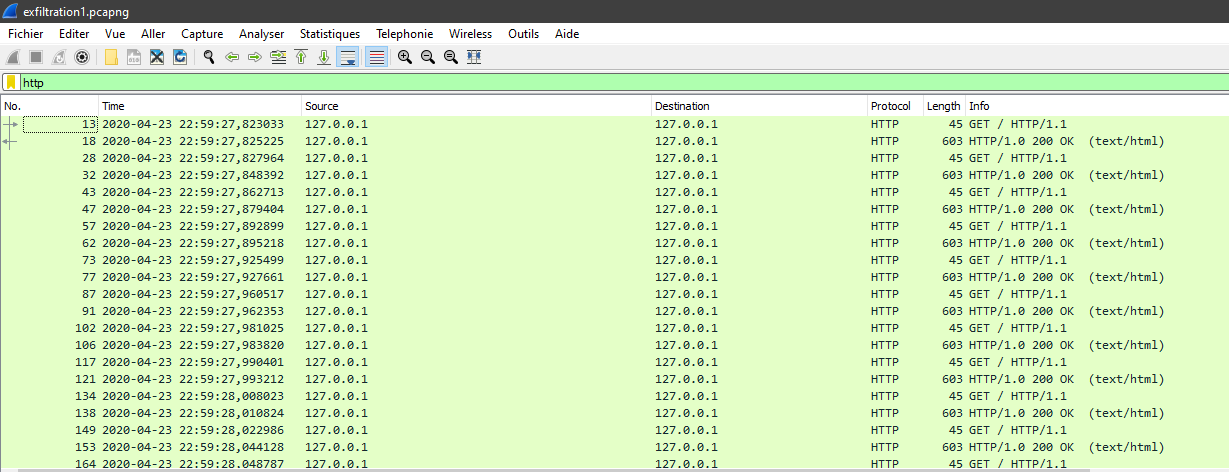 En ouvrant la capture avec Wireshark, on remarque qu'il y a un fort trafic http :