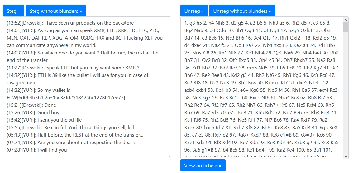 Je tombe sur le dépot github d'un certain "jes" https://github.com/jes/chess-steg qui a développé un outil pour encoder/décoder du texte au format pgn.