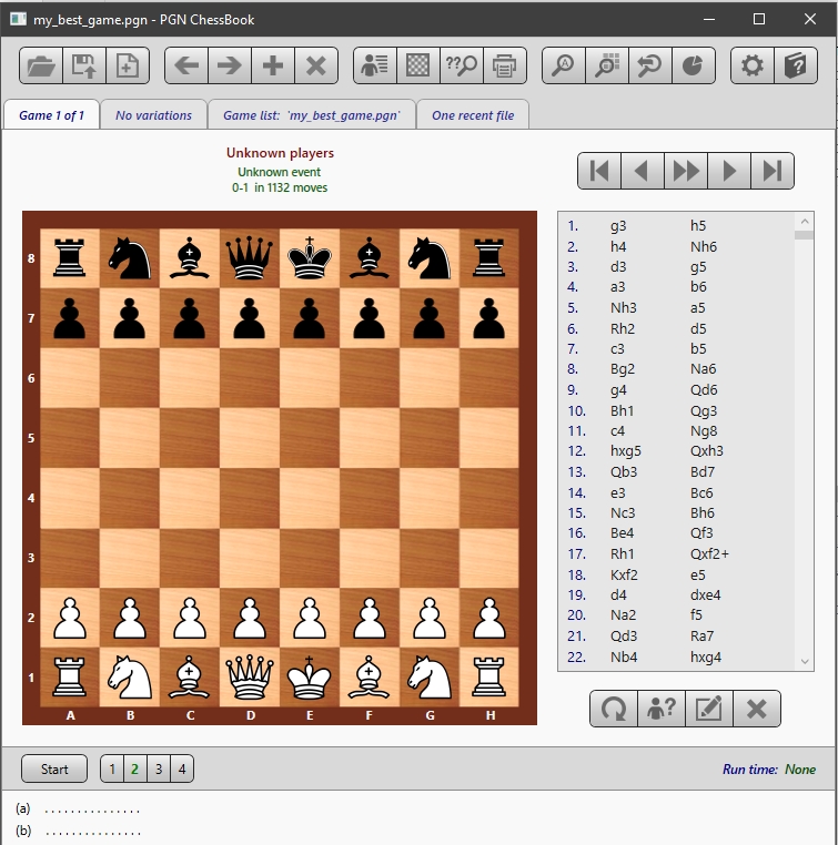 1. g3 h5 2. h4 Nh6 3. d3 g5 4. a3 b6 5. Nh3 a5 6. Rh2 d5 7. c3 b5 8. Bg2 Na6 9. g4 Qd6 10. Bh1 Qg3 11. c4 Ng8 12. hxg5 Qxh3 13. Qb3 Bd7 14. e3 Bc6 15. Nc3 Bh6 16. Be4 Qf3 17. Rh1 Qxf2+ 18. Kxf2 e5 19. d4 dxe4 20. Na2 f5 21. Qd3 Ra7 22. Nb4 hxg4 23. Ke2 a4 24. Rd1 Bb7 25. Nc6 Kf8 26. Rh1 Nf6 27. Ke1 Nb4 28. Qe2 Na6 29. Nb4 Ba8 30. Rh2 Bb7 31. Qc2 Bc8 32. Qf2 Bxg5 33. Qh4 c5 34. Qh7 Rhxh7 35. Na2 Ra8 36. Kd1 Bb7 37. Bd2 Re7 38. cxb5 Nd5 39. Rh5 Rc8 40. Rh2 Kg7 41. Bc1 Bh6 42. Re2 Ree8 43. Kd2 g3 44. Rh2 Nf6 45. Rh3 Kg6 46. Kc3 Rc6 47. Kc2 Rf8 48. Nc3 Ne8 49. Rh5 Bc8 50. Rxh6+ Kf7 51. dxe5 Nb4+ 52. axb4 cxb4 53. Kb1 b3 54. e6+ Kg8 55. Nd5 f4 56. Rh1 Ba6 57. exf4 Rc2 58. Nc3 Kg7 59. Be3 Rc1+ 60. Bxc1 Nf6 61. Nxa4 Bc8 62. Rh8 Rf7 63. Rh2 Re7 64. Rf2 Rf7 65. Rh2 Nh7 66. Rxh7+ Kf8 67. Nc5 Rxf4 68. Rh6 Bb7 69. Ra7 Rf3 70. e7+ Ke8 71. Rh5 Bd5 72. Nd7 Be6 73. Rh3 Bg8 74. Ka1 Rf6 75. Rh2 Bd5 76. Ne5 Rf1 77. Nf7 Bc6 78. Ra4 Rxf7 79. Ra2 Rxe7 80. bxc6 Rh7 81. Rxh7 Kf8 82. Bh6+ Ke8 83. Ra5 Kd8 84. Rg5 Ke8 85. c7 e3 86. Rd7 e2 87. Rg8+ Kxd7 88. Re8 e1=B 89. c8=B+ Kc6 90. Rxe1 Kd5 91. Bf8 Kd4 92. Be7 Kd5 93. Re3 Kd4 94. Rxb3 g2 95. Rc3 Ke5 96. Ba6 g1=B 97. b4 Bc5 98. Rc1 Bd4+ 99. Ka2 Ke4 100. b5 Ba1 101. Rc5 Bh8 102. Kb3 Kd3 103. Kb4 Kd4 104. Ka5 Ke3 105. Bb7 Bf6 106. Ba6 Bg5 107. Ka4 Kd4 108. Rc3 Ke5 109. Rd3 Bd2 110. Rg3 Bg5 111. Ka3 Kd5 112. Bb4 Bh6 113. Rg7 Bd2 114. Ka2 Be1 115. Be7 Ba5 116. Bf8 Ke6 117. Be7 Bd8 118. Kb2 Bb6 119. Bg5 Bg1 120. Bd8 Kf5 121. Ka2 Be3 122. Rb7 Ba7 123. Kb1 Bb6 124. Rb8 Bg1 125. Kc1 Bf2 126. b6 Be3+ 127. Kd1 Bf4 128. Bb7 Ke5 129. Ra8 Ke6 130. Bh1 Bh2 131. Ra3 Bg1 132. Ra7 Be3 133. Bf6 Bh6 134. Ra3 Bf4 135. Bg2 Bc7 136. Ra8 Bxb6 137. Ra4 Ba5 138. Bd4 Bc3 139. Kc1 Ba5 140. Bh1 Kd6 141. Bc5+ Kd7 142. Bd5 Bb4 143. Bb3 Bd2+ 144. Kb2 Ke8 145. Bd5 Bh6 146. Kb3 Kd7 147. Be4 Bc1 148. Be3 Ke6 149. Ba7 Ke5 150. Be3 Bd2 151. Bf2 Ke6 152. Be3 Ba5 153. Rc4 Kd7 154. Bc6+ Ke7 155. Re4+ Kf8 156. Bb5 Bc7 157. Bf4 Kg7 158. Bg3 Kf6 159. Ka4 Be5 160. Ba6 Kg5 161. Ka5 Kf6 162. Bc8 Kg5 163. Bh4+ Kh6 164. Kb4 Bc3+ 165. Kc4 Bh8 166. Bf6 Kg6 167. Re2 Bxf6 168. Bf5+ Kh6 169. Bh3 Kg7 170. Kb5 Bg5 171. Re1 Kh6 172. Ka4 Kg6 173. Re4 Bf6 174. Bf1 Kg7 175. Rb4 Be5 176. Rb3 Bd6 177. Kb5 Kf8 178. Rb4 Be7 179. Bc4 Bd8 180. Bg8 Be7 181. Kc6 Bh4 182. Ra4 Ke8 183. Kc5 Bd8 184. Bd5 Bb6+ 185. Kb4 Ba7 186. Kc3 Bf2 187. Kd2 Kd8 188. Bb7 Ke8 189. Kc2 Kf8 190. Rd4 Ke8 191. Ra4 Ke7 192. Kc1 Bb6 193. Bf3 Ke6 194. Kc2 Kf6 195. Bd5 Ba7 196. Rg4 Bd4 197. Rxd4 Ke5 198. Rd1 Kf4 199. Rc1 Ke5 200. Kc3 Kf4 201. Kd4 Kf5 202. Rd1 Kg4 203. Ra1 Kh5 204. Kc3 Kg4 205. Bg8 Kf5 206. Ra4 Ke5 207. Ra3 Ke4 208. Ba2 Ke5 209. Bf7 Kf4 210. Bc4 Kg3 211. Ra8 Kh3 212. Bd5 Kg4 213. Bh1 Kf5 214. Rg8 Kf6 215. Bg2 Ke5 216. Rg7 Kf4 217. Kc2 Ke5 218. Kb2 Kd6 219. Rg8 Kd7 220. Bf1 Kc6 221. Bc4 Kc5 222. Ka2 Kd6 223. Ka3 Ke5 224. Bd5 Kf6 225. Ba8 Ke5 226. Rg5+ Kf4 227. Be4 Ke3 228. Bf3 Kd4 229. Rg8 Kc3 230. Ka2 Kc4 231. Kb2 Kb4 232. Be2 Ka5 233. Rb8 Ka4 234. Bf3 Ka5 235. Kb1 Ka6 236. Rb7 Ka5 237. Be2 Ka4 238. Rb4+ Ka5 239. Ka1 Kxb4 240. Bb5 Kb3 241. Bd7 Kc4 242. Ba4 Kc5 243. Ka2 Kd5 244. Kb1 Kd4 245. Be8 Ke4 246. Ka1 Kf3 247. Bd7 Kg2 248. Ba4 Kg1 249. Bd1 Kg2 250. Kb1 Kg1 251. Bg4 Kh2 252. Ka1 Kh1 253. Bh3 Kh2 254. Bf1 Kg3 255. Bb5 Kh2 256. Ka2 Kg1 257. Kb1 Kf2 258. Ba4 Ke1 259. Bd7 Kf1 260. Bc6 Kf2 261. Ba4 Kg3 262. Bb5 Kh3 263. Bd7+ Kh4 264. Ka2 Kh5 265. Bb5 Kg4 266. Be2+ Kh4 267. Kb3 Kg5 268. Bf3 Kf4 269. Ka4 Ke5 270. Ba8 Kd4 271. Be4 Ke5 272. Bh7 Kf6 273. Bg6 Ke6 274. Bb1 Kd6 275. Ka5 Kc7 276. Bg6 Kd7 277. Be8+ Kc8 278. Ba4 Kd8 279. Kb4 Kc7 280. Bc2 Kb8 281. Kc3 Ka8 282. Kd2 Kb8 283. Ke1 Ka8 284. Kf2 Kb7 285. Kg1 Ka6 286. Kh1 Kb6 287. Bf5 Kb7 288. Kg1 Ka8 289. Bg4 Kb7 290. Kf2 Kb8 291. Kf1 Kb7 292. Bf3+ Ka7 293. Bh1 Kb8 294. Kg1 Kc8 295. Bg2 Kb8 296. Kf2 Ka7 297. Bh1 Kb6 298. Bd5 Ka7 299. Be6 Ka8 300. Bg8 Kb8 301. Bh7 Kc8 302. Ke3 Kd8 303. Bb1 Ke8 304. Kd4 Kd7 305. Kd5 Kc7 306. Kc5 Kb8 307. Kb4 Ka8 308. Kc4 Ka7 309. Bf5 Ka6 310. Kb4 Kb7 311. Ka4 Kb8 312. Kb5 Ka7 313. Bh3 Kb8 314. Kc4 Kb7 315. Kd5 Ka6 316. Be6 Ka5 317. Bg8 Ka6 318. Ke6 Kb5 319. Kd6 Kb4 320. Kd5 Ka4 321. Ke5 Kb4 322. Bf7 Ka5 323. Kf5 Kb4 324. Kg6 Ka3 325. Kh7 Ka4 326. Be6 Ka3 327. Kg7 Kb2 328. Bd5 Kc1 329. Bc4 Kd1 330. Kh7 Kc1 331. Bg8 Kd2 332. Kh8 Kc1 333. Kg7 Kd2 334. Ba2 Ke3 335. Bg8 Kf2 336. Bc4 Kg1 337. Ba2 Kf1 338. Kh6 Ke1 339. Kh7 Kd1 340. Kg6 Kc1 341. Kh6 Kd1 342. Bf7 Kc1 343. Bg6 Kb2 344. Be4 Kb3 345. Bf5 Ka4 346. Bc8 Kb3 347. Bf5 Ka3 348. Kg5 Kb4 349. Kf4 Ka4 350. Ke5 Ka3 351. Kf6 Ka2 352. Ke6 Kb2 353. Bh3 Kb1 354. Ke5 Kb2 355. Ke4 Ka3 356. Ke5 Kb3 357. Bg2 Ka3 358. Be4 Kb2 359. Kd6 Kc3 360. Kd7 Kc4 361. Bg2 Kd4 362. Bh1 Kc4 363. Ba8 Kb5 364. Ke7 Kb4 365. Bd5 Kc3 366. Ke8 Kd3 367. Ke7 Kd4 368. Be6 Ke3 369. Ba2 Kf3 370. Bd5+ Ke3 371. Bh1 Kd2 372. Kf7 Kd1 373. Ke7 Kd2 374. Kf6 Kd3 375. Bb7 Kd4 376. Kg7 Kc3 377. Kh6 Kb3 378. Bd5+ Ka4 379. Bf3 Ka5 380. Be4 Ka4 381. Bh7 Kb5 382. Bd3+ Kb6 383. Bg6 Ka7 384. Be4 Kb6 385. Kg6 Ka6 386. Bb1 Kb5 387. Bd3+ Kb4 388. Kg7 Ka3 389. Bh7 Kb2 390. Be4 Ka1 391. Bg2 Ka2 392. Kh8 Kb1 393. Kg8 Kc1 394. Be4 Kb2 395. Bf5 Kc3 396. Bd7 Kc2 397. Be6 Kd1 398. Bb3+ Kc1 399. Ba4 Kb2 400. Bc2 Kc1 401. Bd3 Kd2 402. Kg7 Kxd3 403. Kf7 Kc4 404. Kf6 Kc3 405. Kg6 Kd4 406. Kf7 Ke3 407. Ke8 Kf2 408. Ke7 Kg2 409. Kd8 Kf3 410. Ke8 Ke4 411. Kf7 Kf3 412. Kf8 Ke4 413. Ke8 Kd3 414. Kd7 Kc4 415. Ke8 Kc5 416. Ke7 Kd4 417. Ke8 Kd5 418. Kf7 Kc6 419. Kg7 Kb5 420. Kf7 Kc4 421. Kf6 Kb3 422. Kf5 Kb2 423. Kf4 Ka2 424. Ke3 Kb3 425. Kf3 Kc4 426. Ke4 Kc5 427. Kf3 Kd5 428. Ke3 Ke5 429. Kf3 Kd4 430. Kg4 Ke4 431. Kg3 Ke3 432. Kh3 Kf4 433. Kg2 Kf5 434. Kh1 Kf4 435. Kg1 Ke5 436. Kh2 Kf5 437. Kh1 Kg5 438. Kg1 Kh6 439. Kg2 Kg6 440. Kf3 Kh7 441. Ke3 Kg6 442. Kf3 Kf6 443. Kg2 Kf5 444. Kh1 Ke6 445. Kh2 Kd5 446. Kh1 Kc4 447. Kh2 Kb5 448. Kg3 Ka6 449. Kf4 Ka5 450. Ke5 Kb5 451. Kf6 Kc6 452. Kg5 Kc7 453. Kf5 Kd6 454. Kf6 Kc5 455. Ke7 Kd4 456. Kd6 Kd3 457. Kd7 Kd2 458. Kd6 Kc2 459. Kc7 Kb1 460. Kc8 Kc2 461. Kc7 Kb1 462. Kc6 Kc1 463. Kb5 Kb1 464. Ka5 Ka2 465. Kb4 Kb2 466. Ka4 Kb1 467. Ka5 Kc2 46